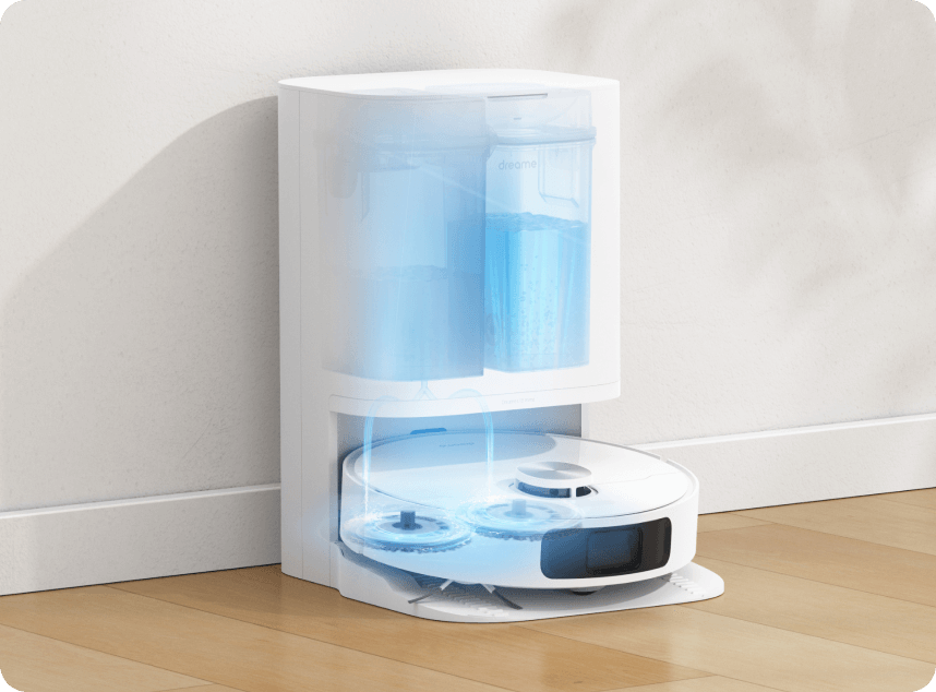 Get clean and dry mops after every cleaning session. L10 Prime automatically returns to the base station during cleaning to wash its mops and scrub them against studs in the removable base plate before continuing cleaning. When cleaning is complete, it washes its mops again in the base station and blows them dry.